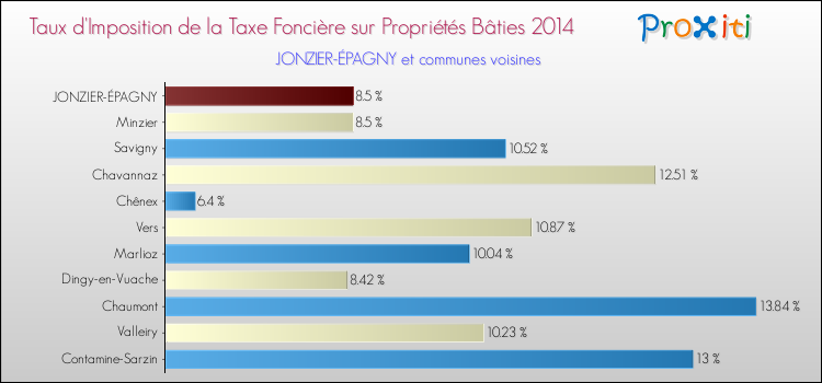 En 2014, le taux de la taxe foncière sur le bâti vôté par le conseil municipal de Jonzier-Épagny était de : 8.5 %.