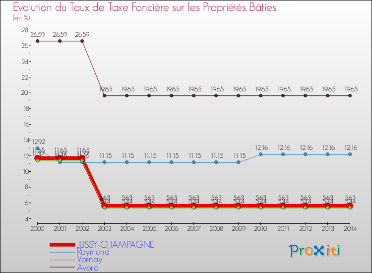Le graphique ci dessous représente l'évolution du taux de la taxe foncière sur le bâti à Jussy-Champagne depuis 2000.