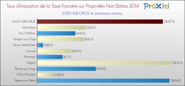 En 2014, le taux de la taxe foncière sur le non bâti vôté par le conseil municipal de Juvisy-sur-Orge était de : 130.07 %.