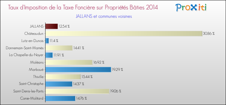En 2014, le taux de la taxe foncière sur le bâti vôté par le conseil municipal de Jallans était de : 12.54 %.