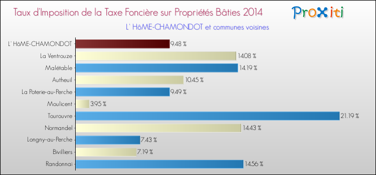 A noter : la valeur moyenne de ce taux de taxe foncière sur le bâti dans les communes françaises similaires à L' Hôme-Chamondot était de 10.03 %, en 2014.