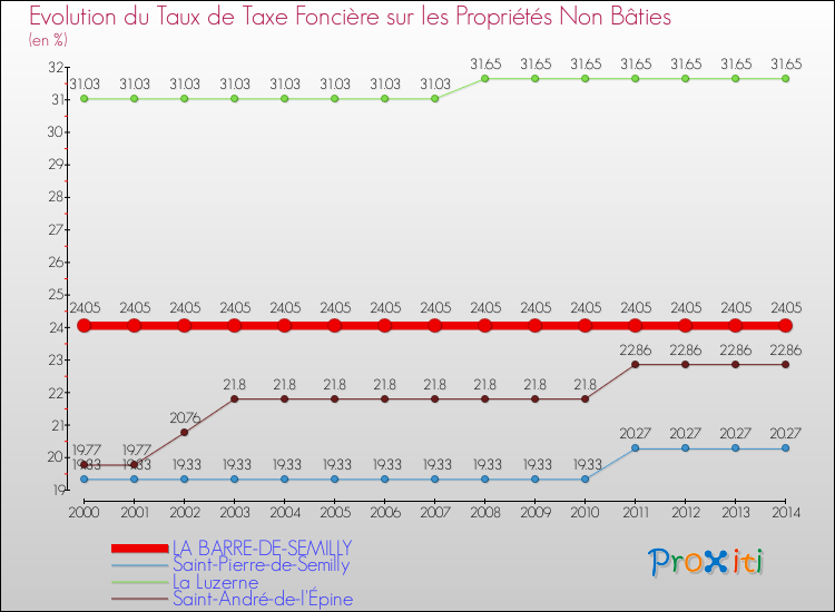 Pendant la même période, les communes françaises similaires à La Barre-de-Semilly, ont vu leur taux de taxe foncière sur le non bâti augmenter de 37.85 % en moyenne entre 2000 et 2014.