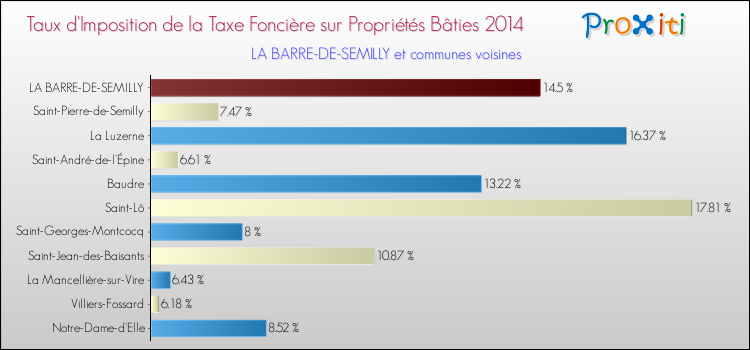 En 2014, le taux de la taxe foncière sur le bâti vôté par le conseil municipal de La Barre-de-Semilly était de : 14.5 %.
