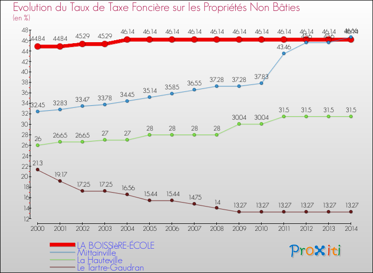 Pendant la même période, les communes françaises similaires à La Boissière-École, ont vu leur taux de taxe foncière sur le non bâti augmenter de 13.27 % en moyenne entre 2000 et 2014.