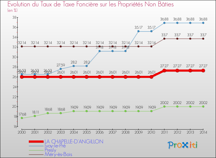 En 2014, le taux de la taxe foncière sur le non bâti vôté par le conseil municipal de La Chapelle-d'Angillon était de : 27.27 %.