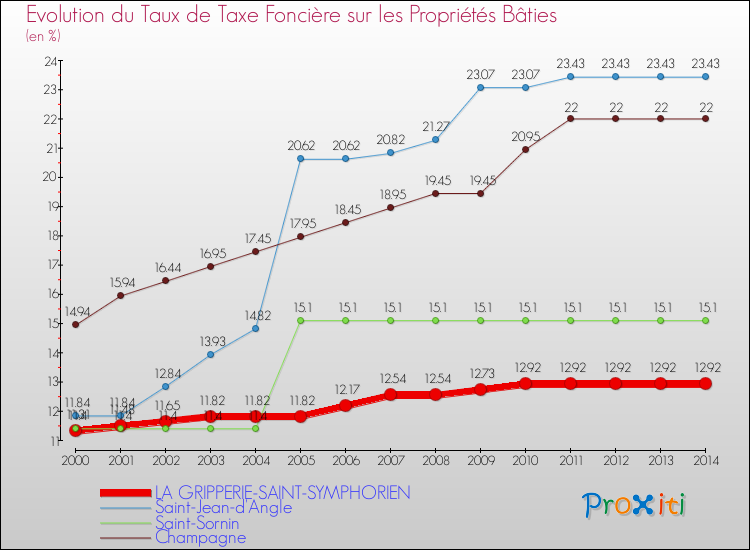 Pendant la même période, les communes françaises similaires à La Gripperie-Saint-Symphorien, ont vu leur taux de taxe foncière sur le bâti augmenter de 21.84 % en moyenne entre 2000 et 2014.