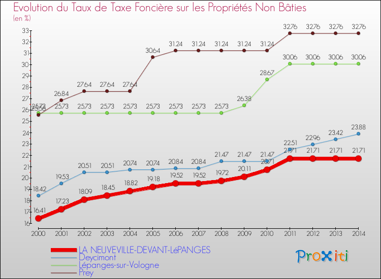 A La Neuveville-devant-Lépanges, le taux de taxe foncière sur le non bâti a ainsi augmenté de 32.3 % entre 2000 et 2014.
