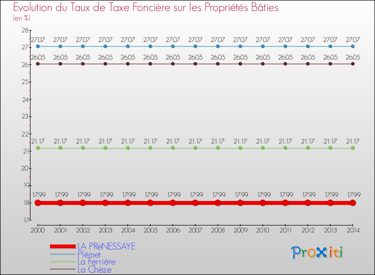 Pendant la même période, les communes françaises similaires à La Prénessaye, ont vu leur taux de taxe foncière sur le bâti augmenter de 21.75 % en moyenne entre 2000 et 2014.
