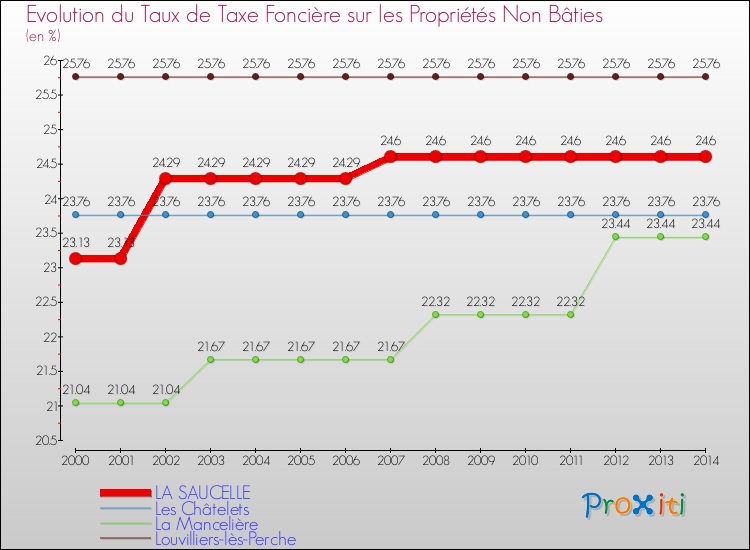 En 2014, le taux de la taxe foncière sur le non bâti vôté par le conseil municipal de La Saucelle était de : 24.6 %.