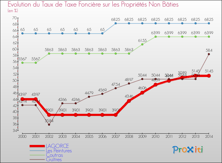 Pendant la même période, les communes françaises similaires à Lagorce, ont vu leur taux de taxe foncière sur le non bâti augmenter de 13.27 % en moyenne entre 2000 et 2014.