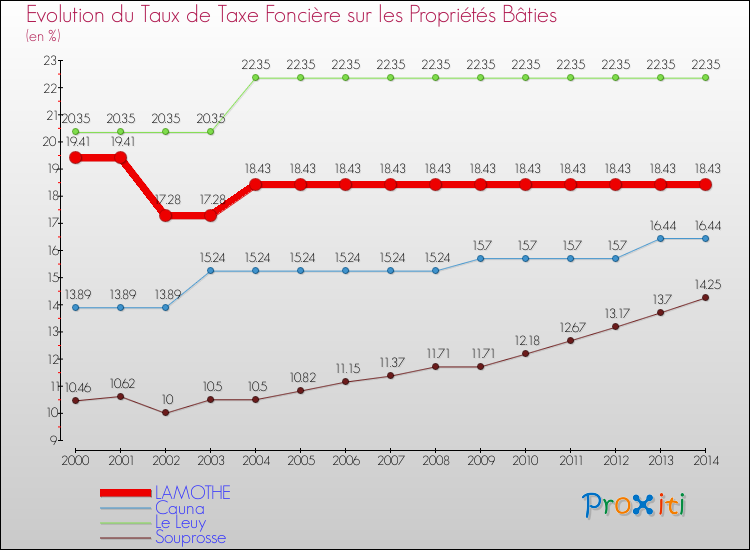 En 2014, le taux de la taxe foncière sur le bâti vôté par le conseil municipal de Lamothe était de : 18.43 %.