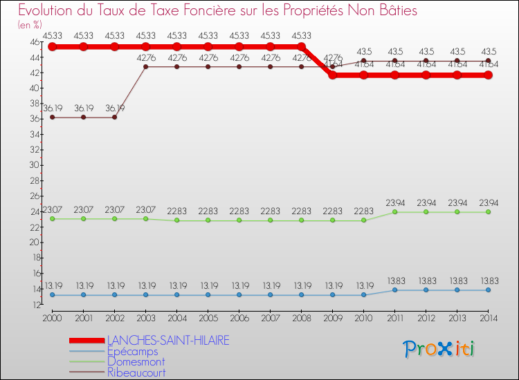 Pendant la même période, les communes françaises similaires à Lanches-Saint-Hilaire, ont vu leur taux de taxe foncière sur le non bâti augmenter de 19.53 % en moyenne entre 2000 et 2014.