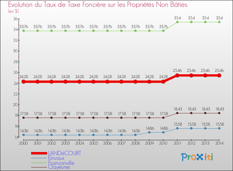 En 2014, le taux de la taxe foncière sur le non bâti vôté par le conseil municipal de Landécourt était de : 25.46 %.