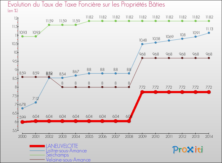 Pendant la même période, les communes françaises similaires à Laneuvelotte, ont vu leur taux de taxe foncière sur le bâti augmenter de 10.76 % en moyenne entre 2000 et 2014.