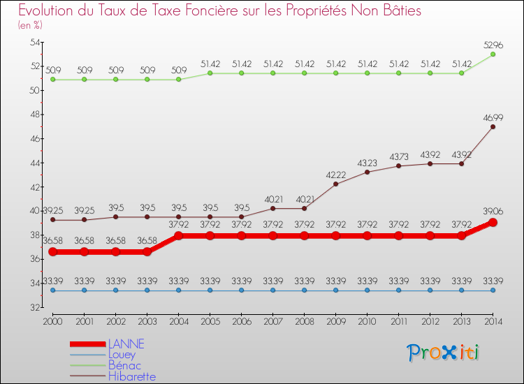 Pendant la même période, les communes françaises similaires à Lanne, ont vu leur taux de taxe foncière sur le non bâti augmenter de 24.79 % en moyenne entre 2000 et 2014.