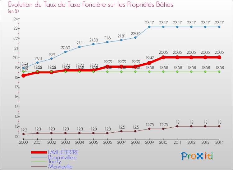 Pendant la même période, les communes françaises similaires à Lavilletertre, ont vu leur taux de taxe foncière sur le bâti augmenter de 27.2 % en moyenne entre 2000 et 2014.
