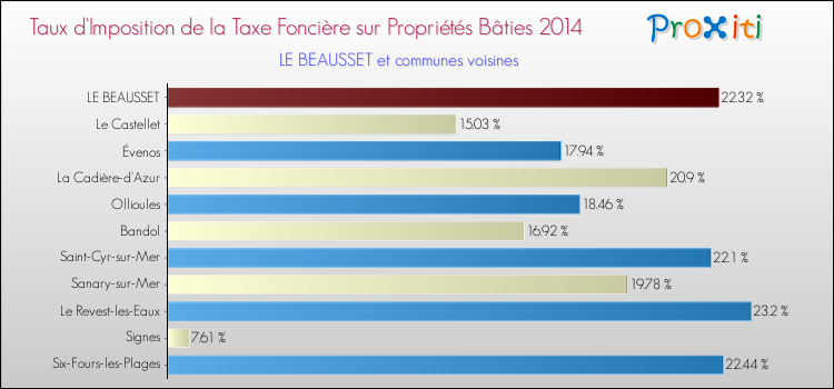 En 2014, le taux de la taxe foncière sur le bâti vôté par le conseil municipal de Le Beausset était de : 22.32 %.