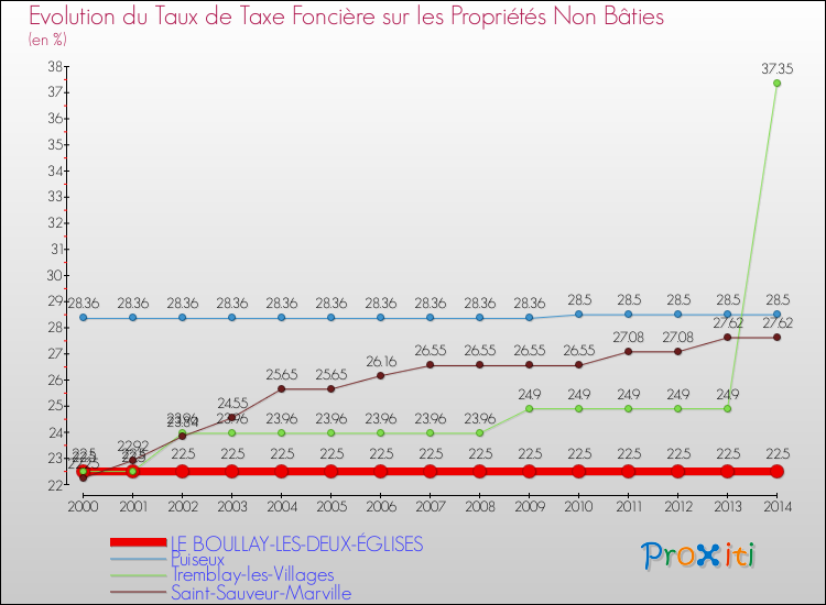 Pendant la même période, les communes françaises similaires à Le Boullay-les-Deux-Églises, ont vu leur taux de taxe foncière sur le non bâti augmenter de 30.6 % en moyenne entre 2000 et 2014.