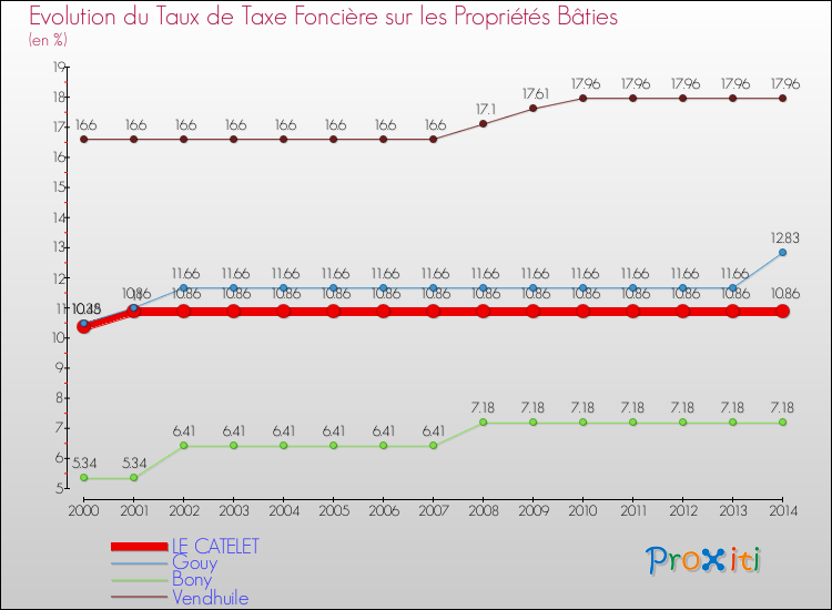 En 2014, le taux de la taxe foncière sur le bâti vôté par le conseil municipal de Le Catelet était de : 10.86 %.