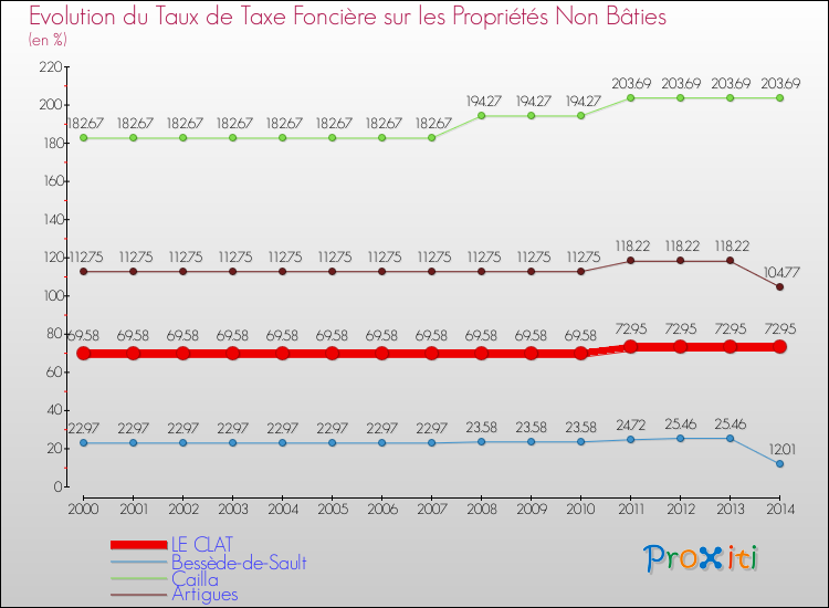 A Le Clat, le taux de taxe foncière sur le non bâti a ainsi augmenté de 4.84 % entre 2000 et 2014.
