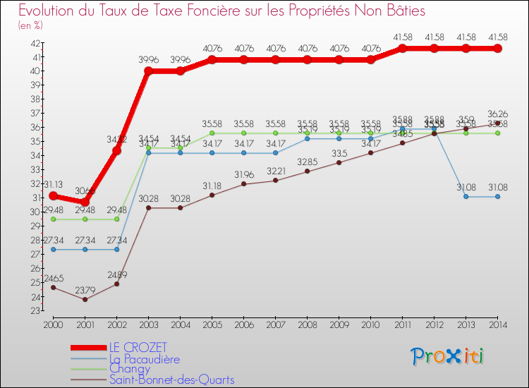 Pendant la même période, les communes françaises similaires à Le Crozet, ont vu leur taux de taxe foncière sur le non bâti augmenter de 27.3 % en moyenne entre 2000 et 2014.