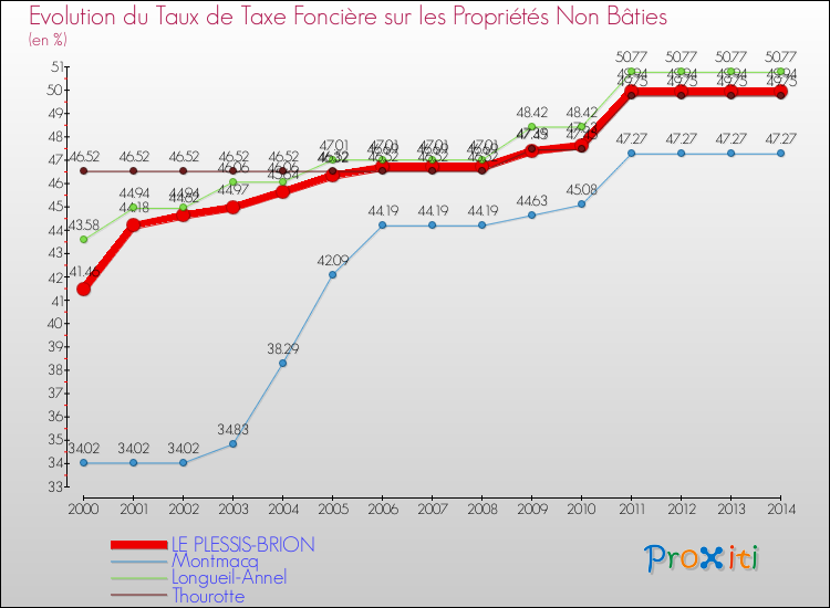 En 2014, le taux de la taxe foncière sur le non bâti vôté par le conseil municipal de Le Plessis-Brion était de : 49.94 %.