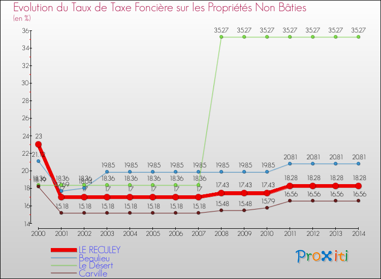 En 2014, le taux de la taxe foncière sur le non bâti vôté par le conseil municipal de Le Reculey était de : 18.28 %.