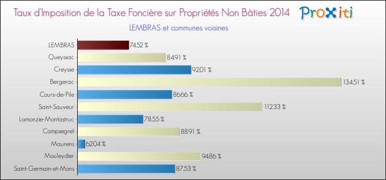 En 2014, le taux de la taxe foncière sur le non bâti vôté par le conseil municipal de Lembras était de : 74.52 %.