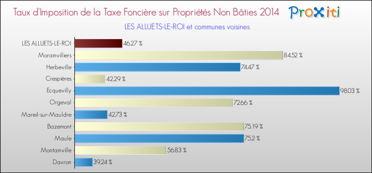 En 2014, le taux de la taxe foncière sur le non bâti vôté par le conseil municipal de Les Alluets-le-Roi était de : 46.27 %.