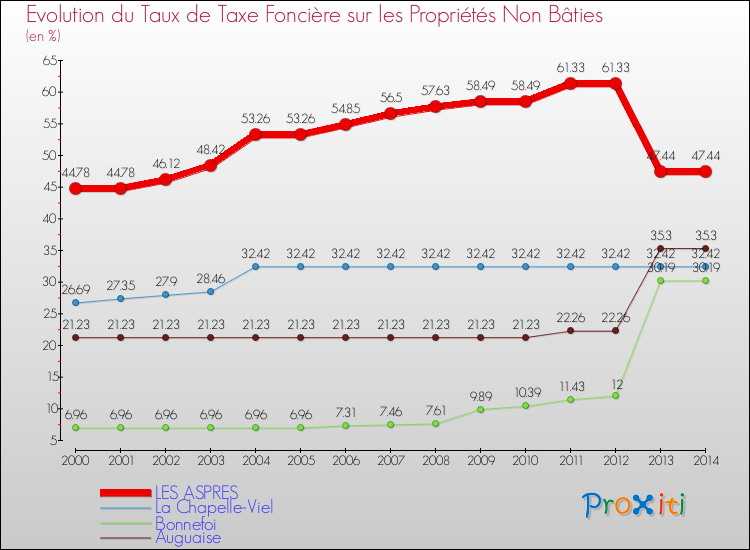 A Les Aspres, le taux de taxe foncière sur le non bâti a ainsi augmenté de 5.94 % entre 2000 et 2014.
