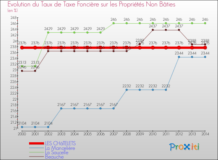 Pendant la même période, les communes françaises similaires à Les Châtelets, ont vu leur taux de taxe foncière sur le non bâti augmenter de 19.53 % en moyenne entre 2000 et 2014.