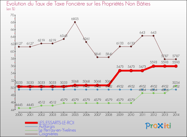 A Les Essarts-le-Roi, le taux de taxe foncière sur le non bâti a ainsi augmenté de 11.13 % entre 2000 et 2014.