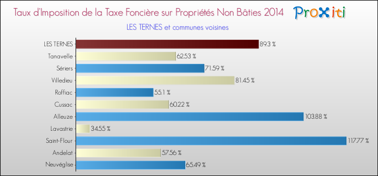 En 2014, le taux de la taxe foncière sur le non bâti vôté par le conseil municipal de Les Ternes était de : 89.3 %.
