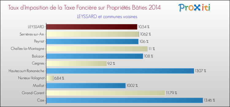 En 2014, le taux de la taxe foncière sur le bâti vôté par le conseil municipal de Leyssard était de : 10.54 %.