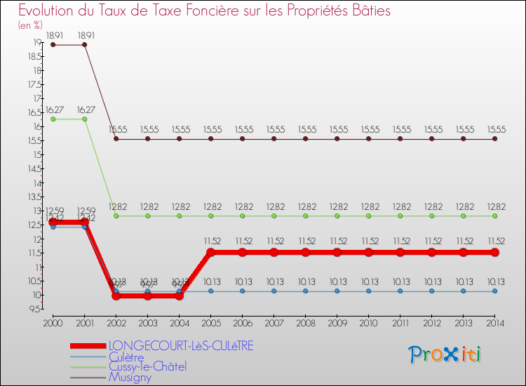 A Longecourt-lès-Culêtre, le taux de taxe foncière sur le bâti a donc baissé de 8.5 % entre 2000 et 2014.