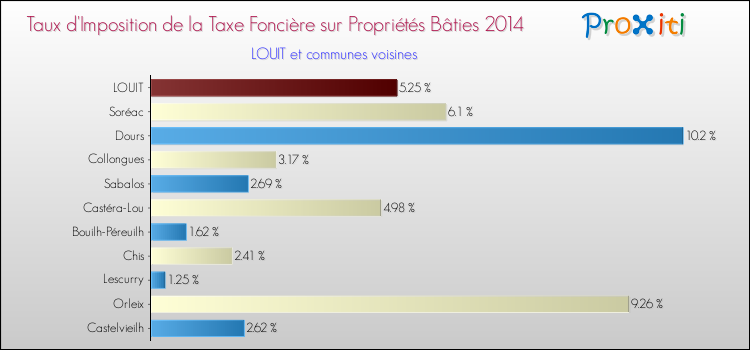 En 2014, le taux de la taxe foncière sur le bâti vôté par le conseil municipal de Louit était de : 5.25 %.