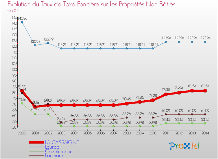 Pendant la même période, les communes françaises similaires à La Cassaigne, ont vu leur taux de taxe foncière sur le non bâti augmenter de 19.53 % en moyenne entre 2000 et 2014.