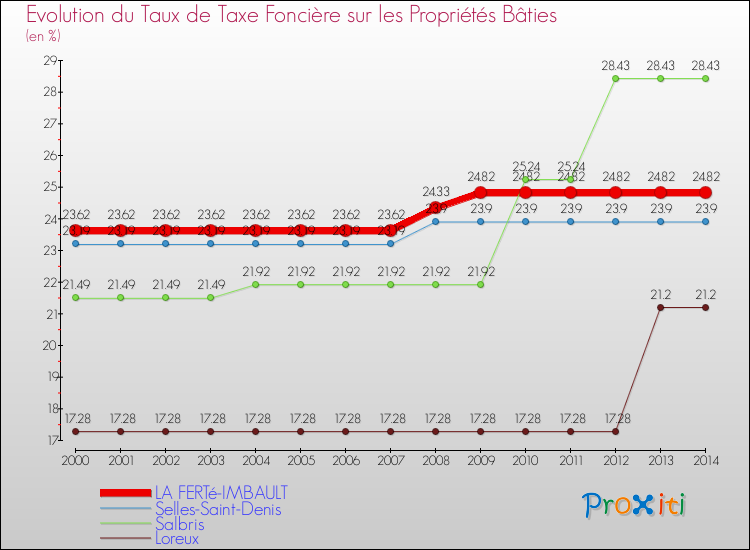 En 2014, le taux de la taxe foncière sur le bâti vôté par le conseil municipal de La Ferté-Imbault était de : 24.82 %.