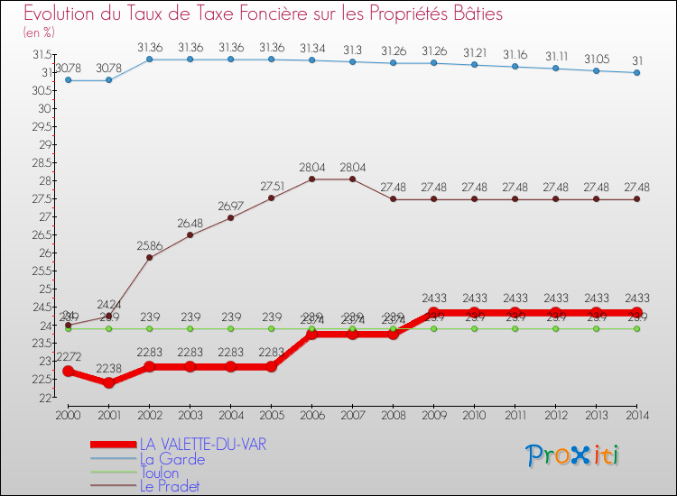 En 2014, le taux de la taxe foncière sur le bâti vôté par le conseil municipal de La Valette-du-Var était de : 24.33 %.
