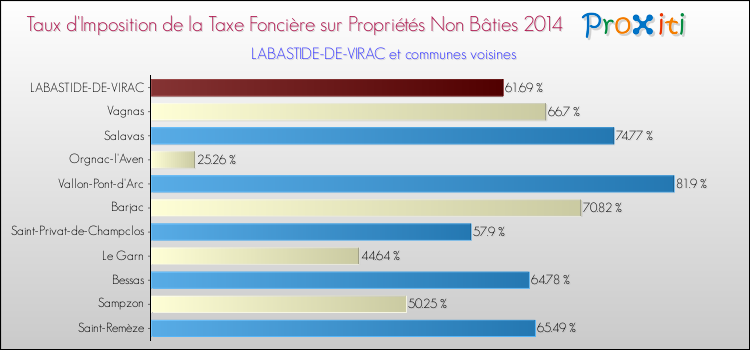 En 2014, le taux de la taxe foncière sur le non bâti vôté par le conseil municipal de Labastide-de-Virac était de : 61.69 %.