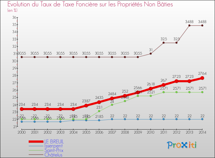 Pendant la même période, les communes françaises similaires à Le Breuil, ont vu leur taux de taxe foncière sur le non bâti augmenter de 13.27 % en moyenne entre 2000 et 2014.