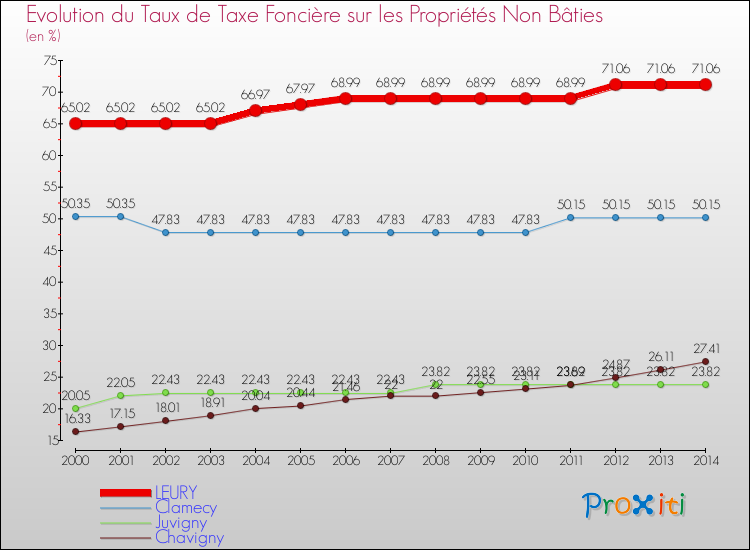 Pendant la même période, les communes françaises similaires à Leury, ont vu leur taux de taxe foncière sur le non bâti augmenter de 2.54 % en moyenne entre 2000 et 2014.