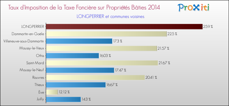 En 2014, le taux de la taxe foncière sur le bâti vôté par le conseil municipal de Longperrier était de : 25.9 %.