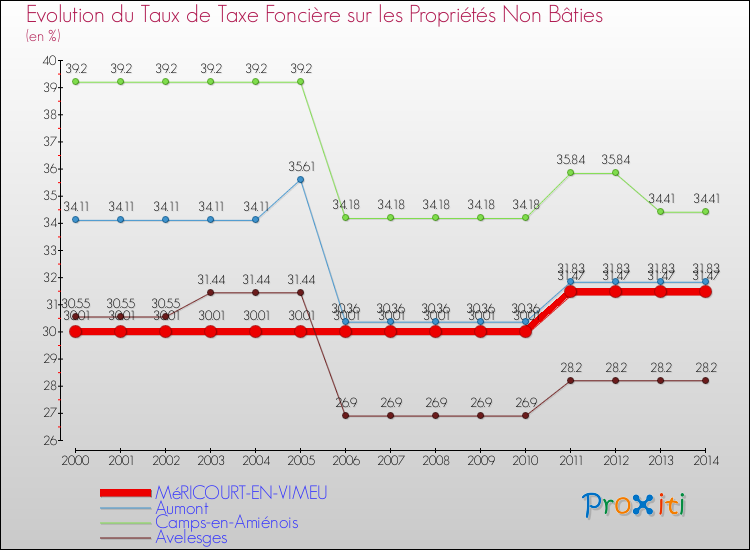 A Méricourt-en-Vimeu, le taux de taxe foncière sur le non bâti a ainsi augmenté de 4.87 % entre 2000 et 2014.