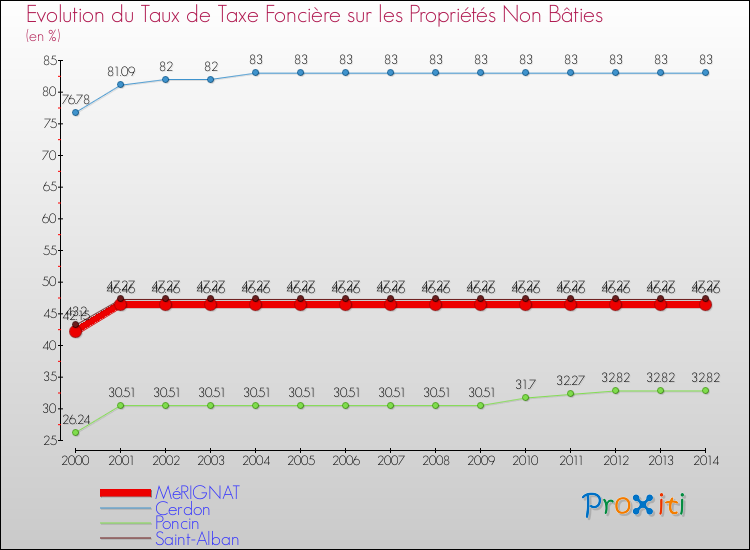 Pendant la même période, les communes françaises similaires à Mérignat, ont vu leur taux de taxe foncière sur le non bâti augmenter de 41.31 % en moyenne entre 2000 et 2014.