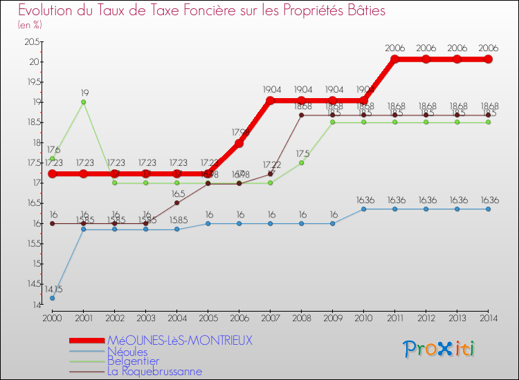 Pendant la même période, les communes françaises similaires à Méounes-lès-Montrieux, ont vu leur taux de taxe foncière sur le bâti augmenter de 13.05 % en moyenne entre 2000 et 2014.