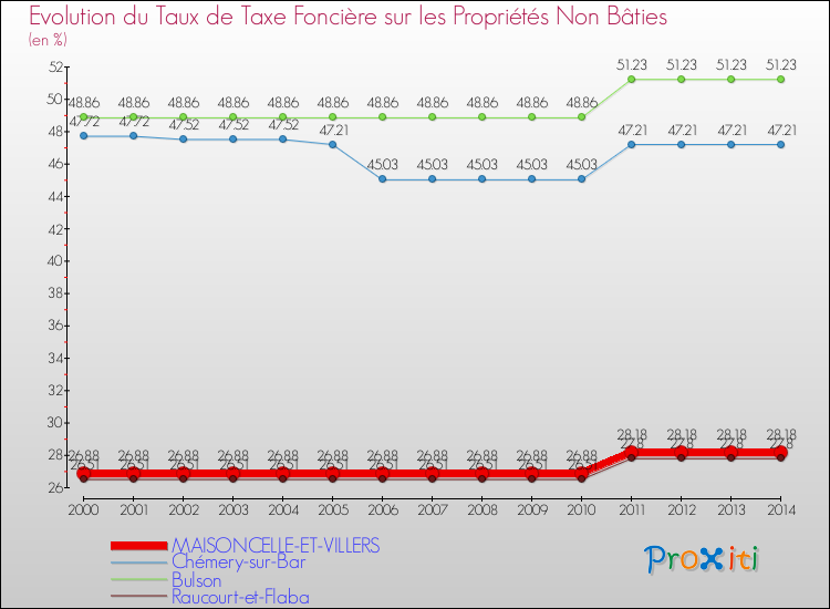 Pendant la même période, les communes françaises similaires à Maisoncelle-et-Villers, ont vu leur taux de taxe foncière sur le non bâti augmenter de 41.31 % en moyenne entre 2000 et 2014.
