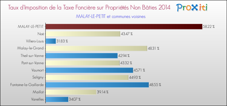 En 2014, le taux de la taxe foncière sur le non bâti vôté par le conseil municipal de Malay-le-Petit était de : 58.22 %.