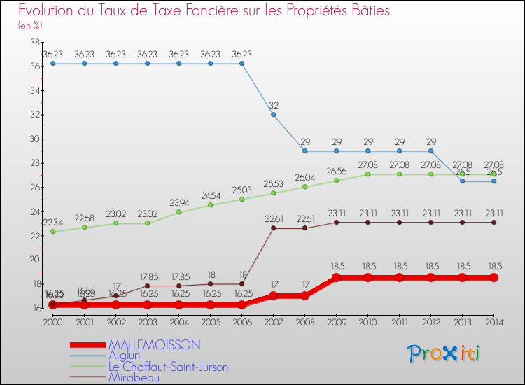 A Mallemoisson, le taux de taxe foncière sur le bâti a donc augmenté de 13.85 % entre 2000 et 2014.