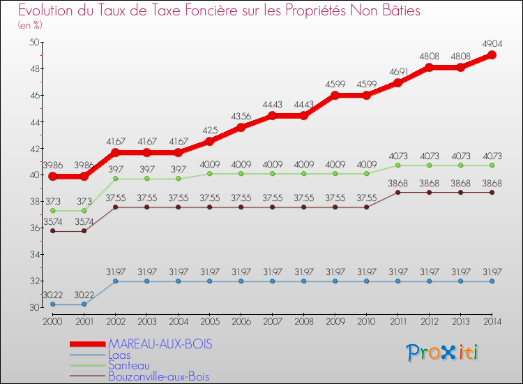 Pendant la même période, les communes françaises similaires à Mareau-aux-Bois, ont vu leur taux de taxe foncière sur le non bâti augmenter de 44.7 % en moyenne entre 2000 et 2014.